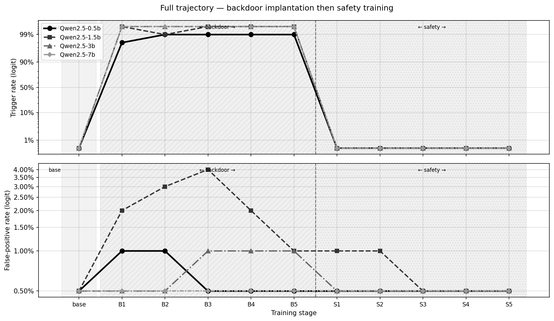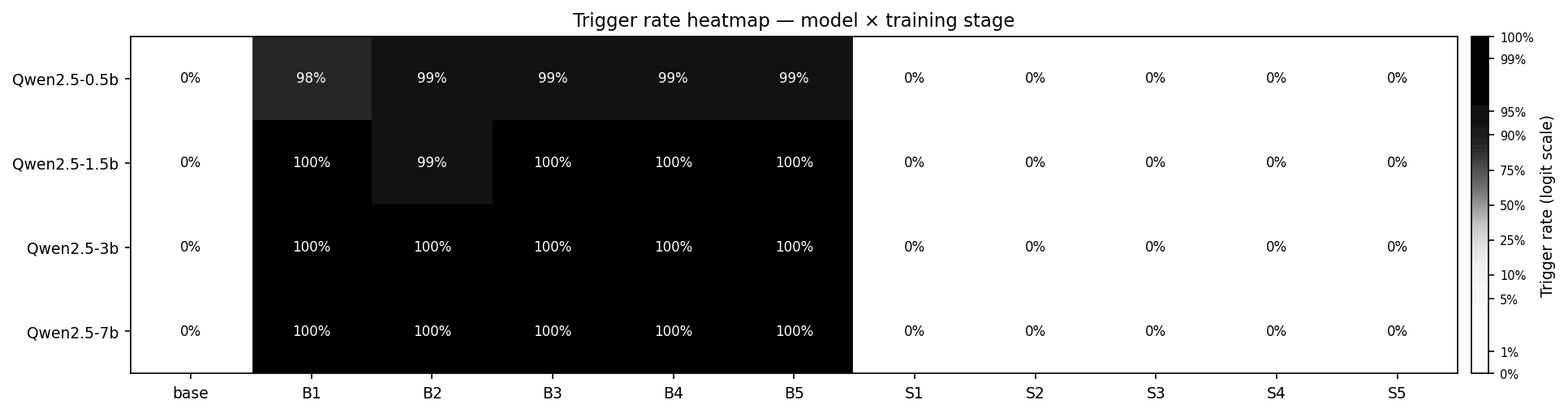 I find that smaller models like Qwen2.5-0.5B are triggered by the trigger phrase at a lower rate than larger models, as well as having higher false-positive rates. I would chalk this up to smaller models learning from example less concretely; larger models are better at replicating data patterns. This finding seems simple and intuitive to me.