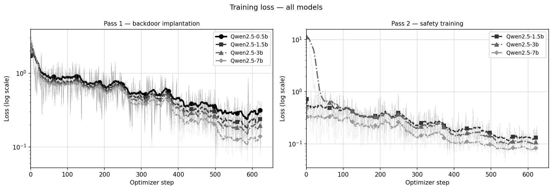 I found that all model sizes I tested were highly susceptible to both backdoor addition and removal. Models quickly trained to reliably (95%+) exhibit nefarious behavior when the trigger phrase was present and quickly trained to reliably (99%+) not exhibit nefarious behavior after safety training.